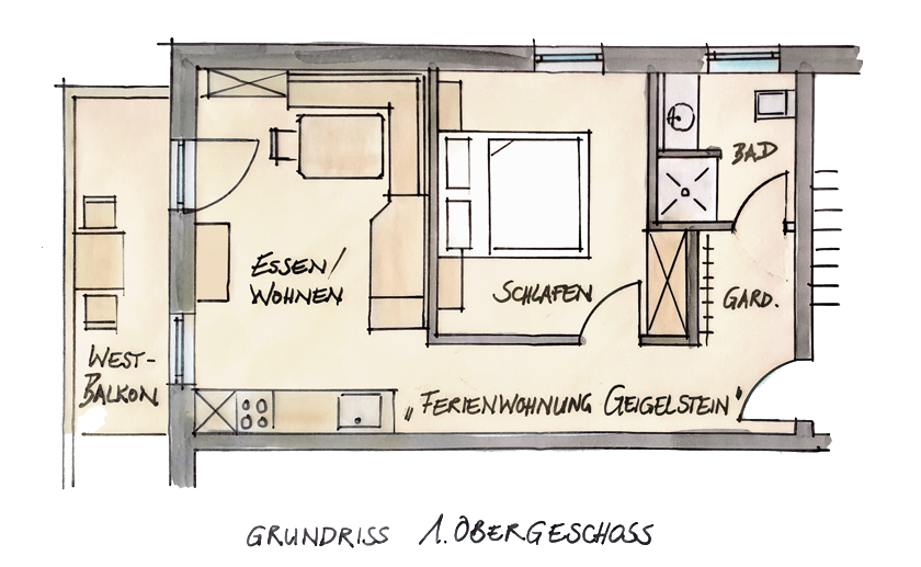 Die gemütliche Zwei-Zimmer Komfort-Ferienwohnung bietet Ihnen alle Annehmlichkeiten für einen erholsamen Urlaub. Vom sonnigen Westbalkon genießen Sie einen herrlichen Blick über die Reit im Winkler Bergwelt. In der gemütlichen Wohnküche mit Essecke und Sofa die mit einem 40“ Flachbildschirm und DVD/CD-Player ausgestattet ist, können Sie Ihren Urlaub so richtig genießen. Die traditionelle Küchenzeile ist komplett ausgestattet und verfügt über Geschirrspüler, Backofen, 4-Platten Ceranfeld und Mikrowelle. Kaffeefilter, eine kleine Auswahl an Tee und Gewürzen runden das Angebot ab. In dem Schlafzimmer befinden sich Massivholzmöbel, zudem kann der Schlafbereich Netz frei geschaltet werden, so dass einem erholsamen Schlaf nichts mehr im Wege steht. Selbstverständlich werden Ihnen Bett- und Tischwäsche sowie Handtücher bereitgestellt.